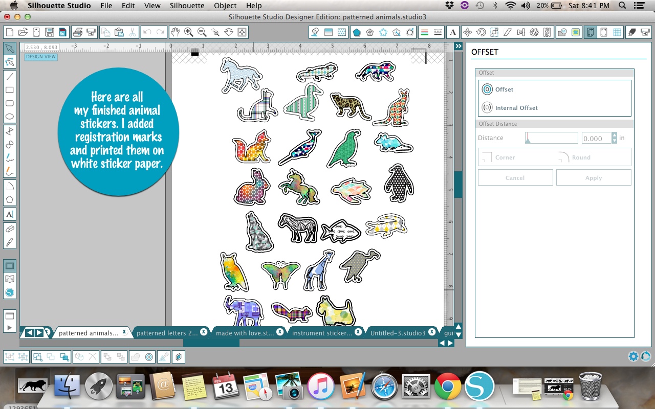 Look at all of those cute patterned animal silhouettes! So much fun! I printed the stickers with my printer and then cut them out with the Silhouette.