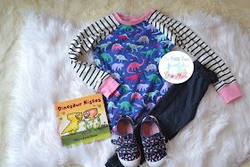 This pattern has size options from 3m-14 and it has multiple sleeve and hem options. For the deer one I made a straight hem with long cuffed sleeves and for the dinosaur one I made a curved hem with long cuffed sleeves. You can also buy an add on pack to add other fun features to the shirt. It was an extremely easy sew.